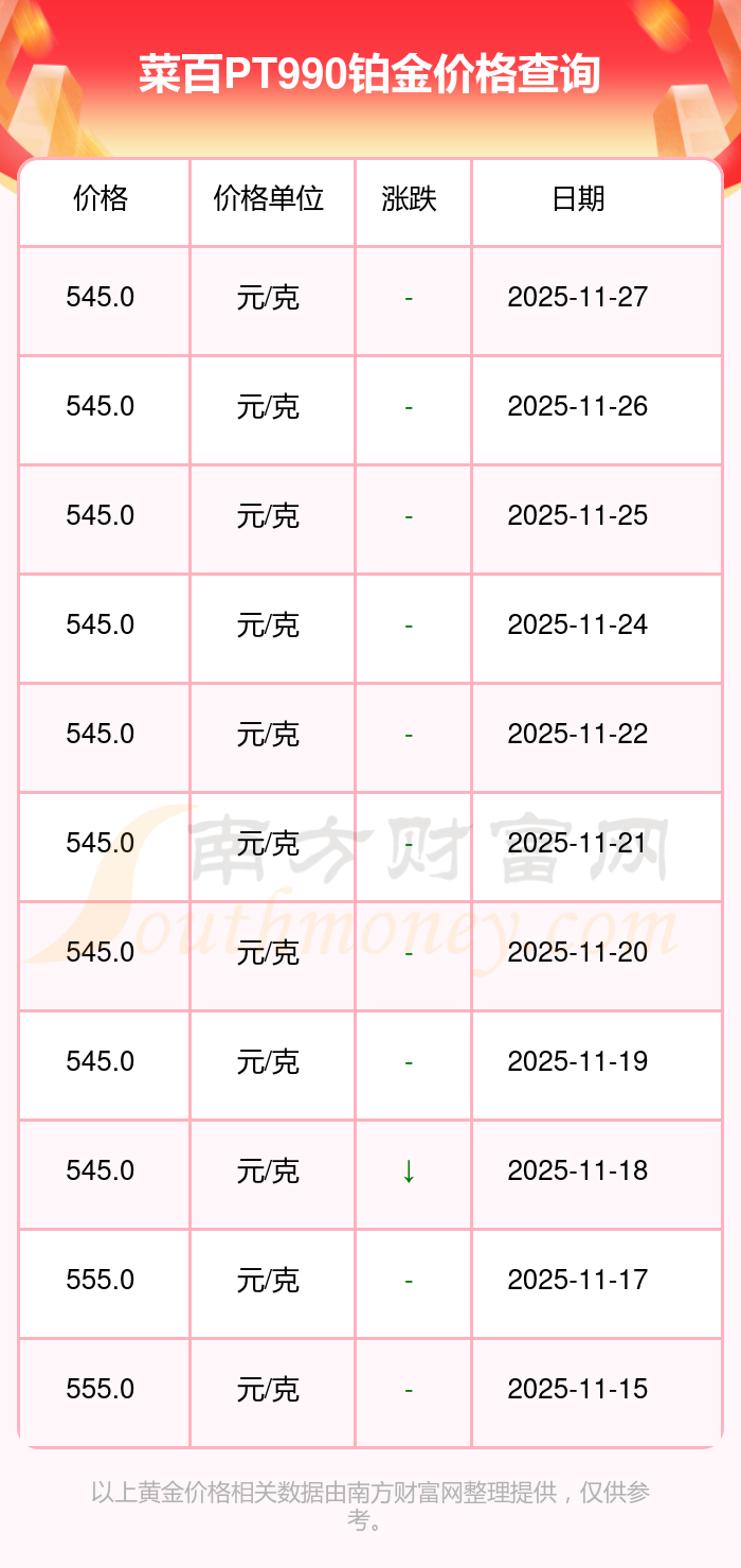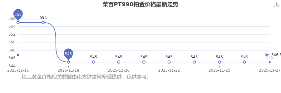 2025年11月27日菜百PT990鉑金價格查詢:545.0元/克。