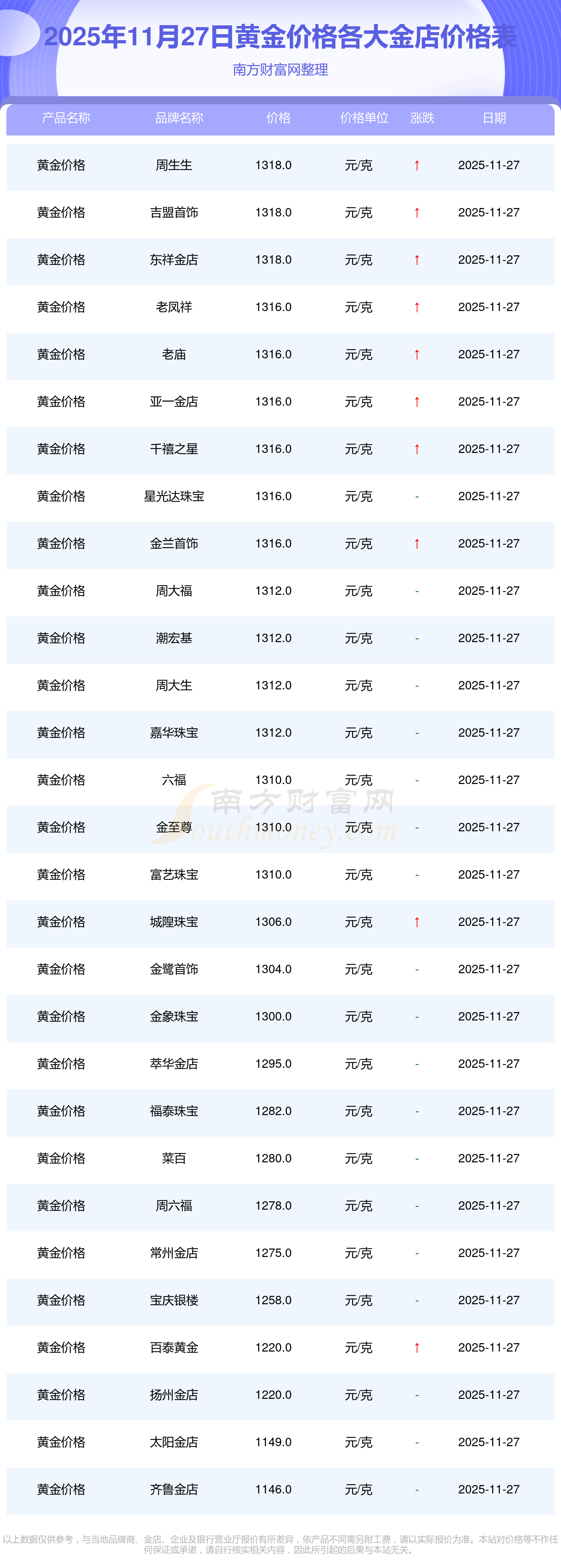 2025年11月27日周大福、周大福、老鳳祥、老鳳祥、六福、六福、六福、菜百、菜百、老廟、老廟等各大金店品牌黃金價格最新價格如下:周大福黃金價格1312.0元/克,周大福鉑金價格652.0元/克,老鳳祥黃金價格1316.0元/克,老鳳祥鉑金價格600.0元/克,六福黃金價格1310.0元/克,六福鉑金價格652.0元/克,六福鉑金價格(香港)18700.0,菜百黃金價格1280.0元/克,菜百鉑金價格540.0元/克,老廟黃金價格1316.0元/克,老廟鉑金價格600.0元/克。