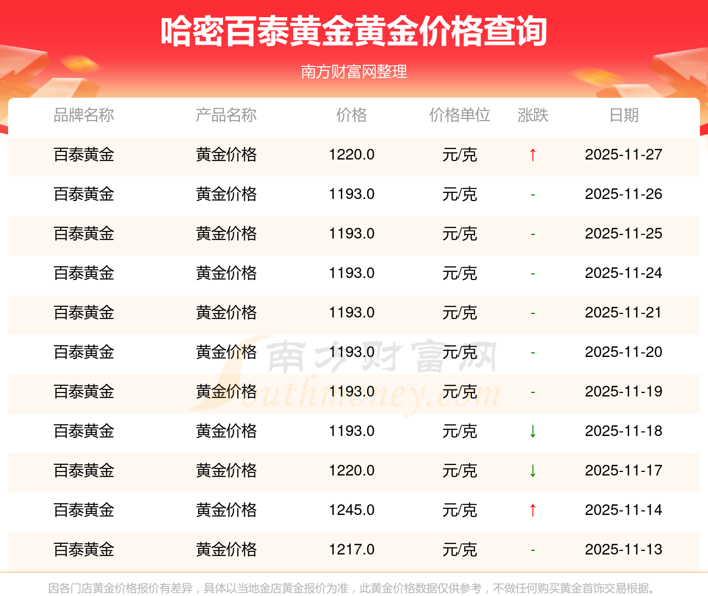 今日哈密百泰黃金黃金價(jià)格公布黃金每克價(jià)值多少錢今日(2025年11月27日)哈密百泰黃金黃金價(jià)格:1220.0元/克。