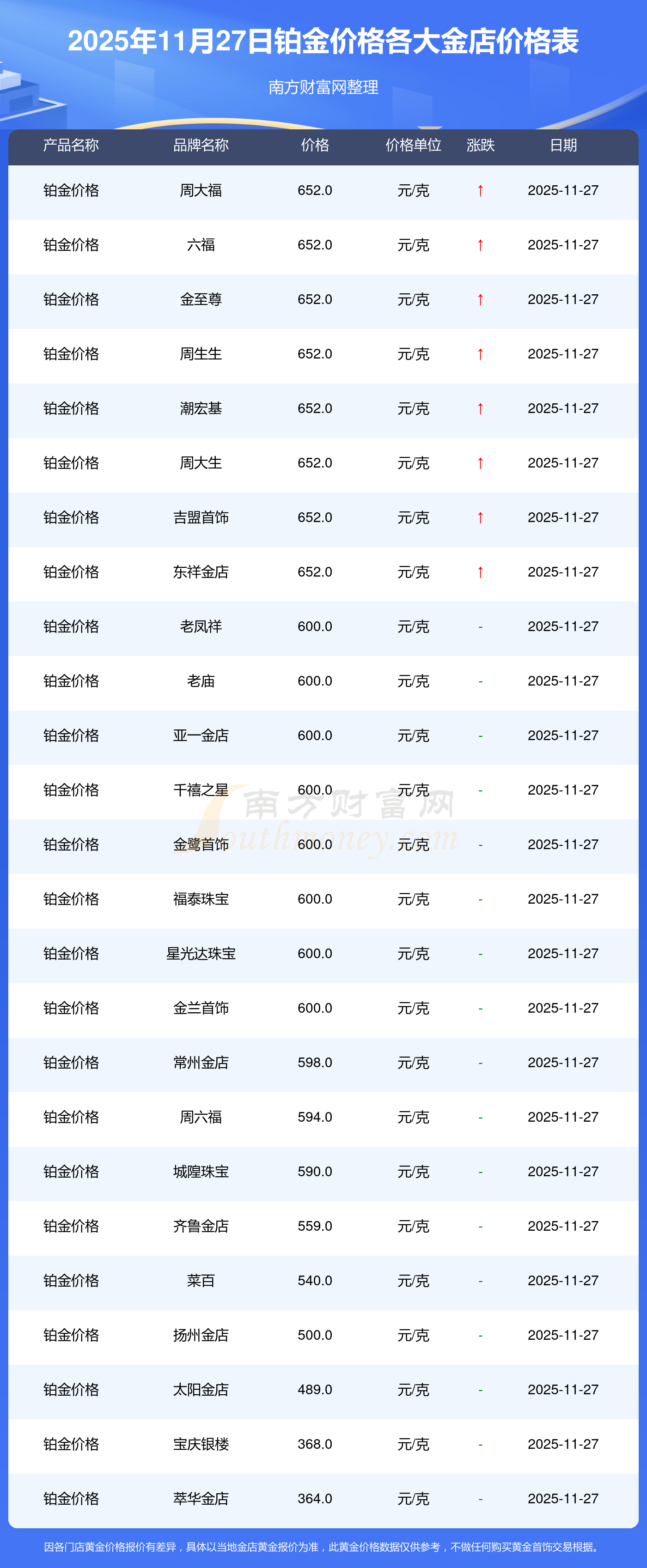 2025年11月27日周大福、周大福、老鳳祥、老鳳祥、六福、六福、六福、菜百、菜百、老廟、老廟等各大金店品牌鉑金價格最新價格如下:周大福黃金價格1312.0元/克,周大福鉑金價格652.0元/克,老鳳祥黃金價格1316.0元/克,老鳳祥鉑金價格600.0元/克,六福黃金價格1310.0元/克,六福鉑金價格652.0元/克,六福鉑金價格(香港)18700.0,菜百黃金價格1280.0元/克,菜百鉑金價格540.0元/克,老廟黃金價格1316.0元/克,老廟鉑金價格600.0元/克。