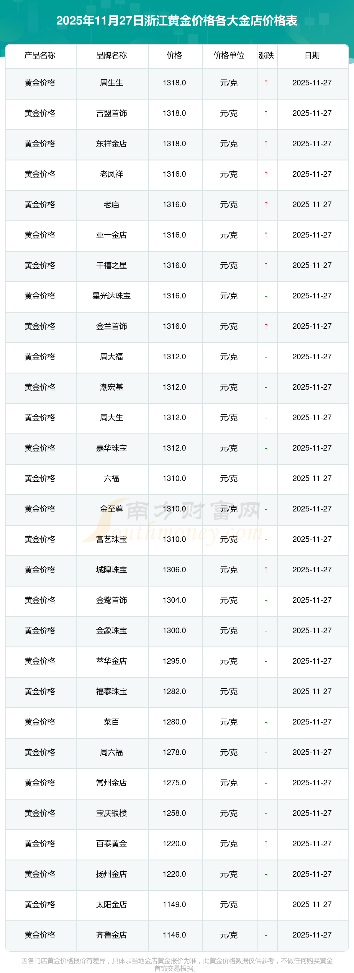 今天是2025年11月27日,浙江周大福、周大福、老鳳祥、老鳳祥、六福、六福、六福、菜百、菜百、老廟、老廟等各大金店品牌黃金價格最新價格如下:周大福1312.0元/克、周大福652.0元/克、老鳳祥1316.0元/克、老鳳祥600.0元/克、六福1310.0元/克、六福652.0元/克、六福18700.0、菜百1280.0元/克、菜百540.0元/克、老廟1316.0元/克、老廟600.0元/克。