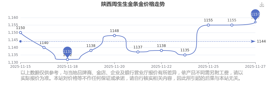 今日(2025年11月27日),陜西周生生金條金價(jià)的價(jià)格是1157.0元/克。