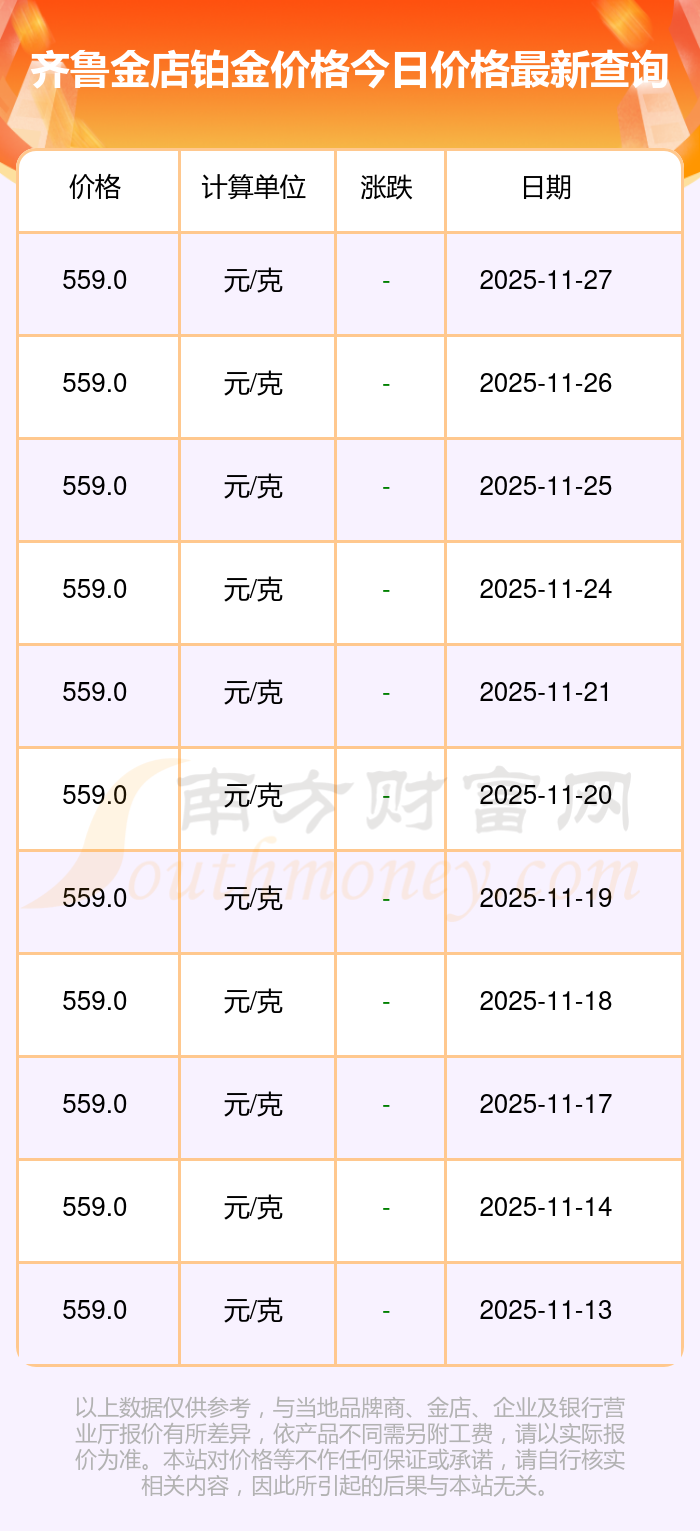 據(jù)了解,今日齊魯金店 鉑金價格的最新價格為559.0元/克。
