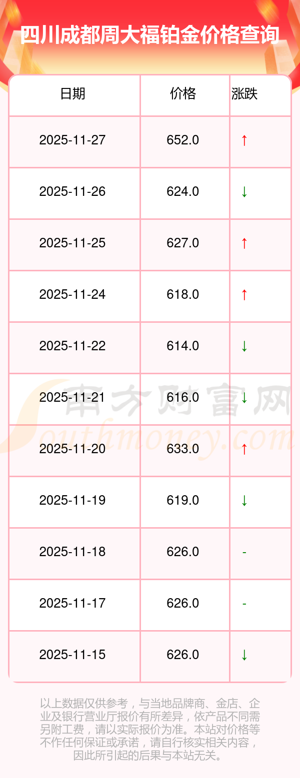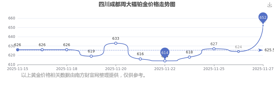 今日四川成都周大福鉑金價(jià)格最新為:652.0元/克。