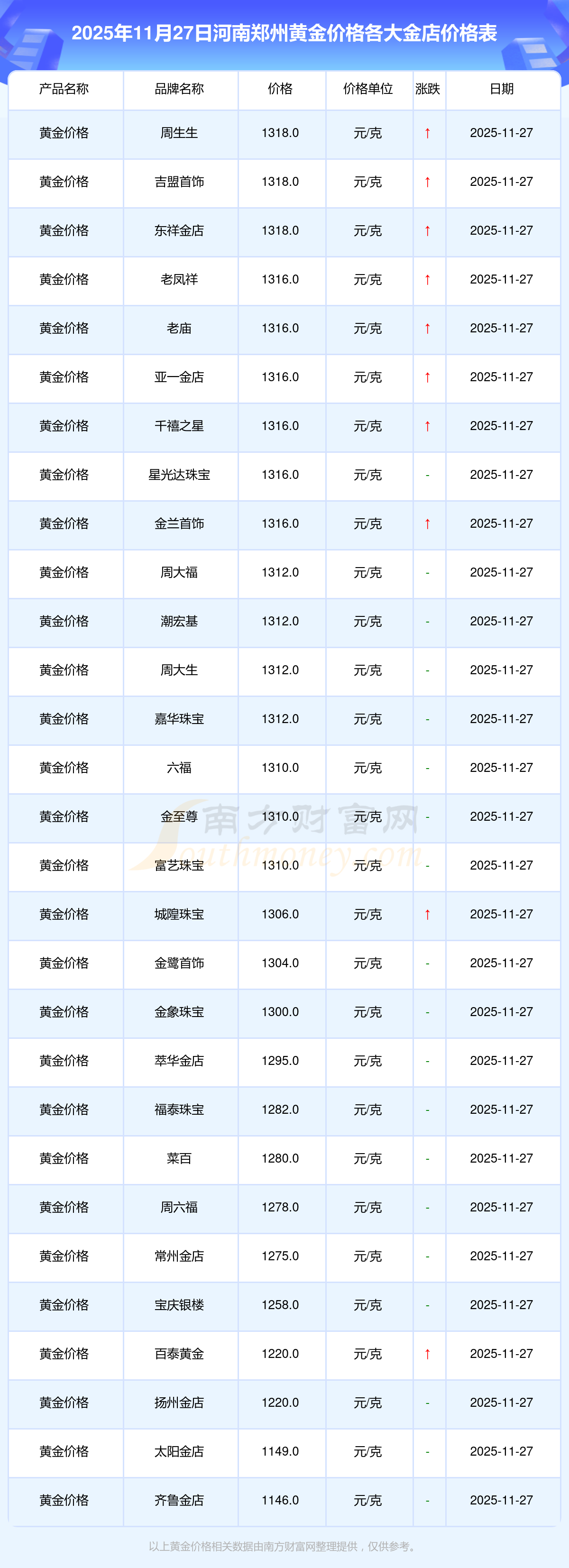 2025年11月27日,河南鄭州周大福、周大福、老鳳祥、老鳳祥、六福、六福、六福、菜百、菜百、老廟、老廟等各大金店品牌黃金價(jià)格今日價(jià)格行情最新來(lái)了:周大福1312.0元/克、周大福652.0元/克、老鳳祥1316.0元/克、老鳳祥600.0元/克、六福1310.0元/克、六福652.0元/克、六福18700.0、菜百1280.0元/克、菜百540.0元/克、老廟1316.0元/克、老廟600.0元/克。