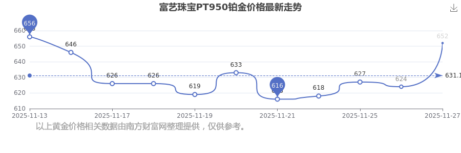今日(2025年11月27日)富藝珠寶PT950鉑金的價(jià)格為652.0元/克。