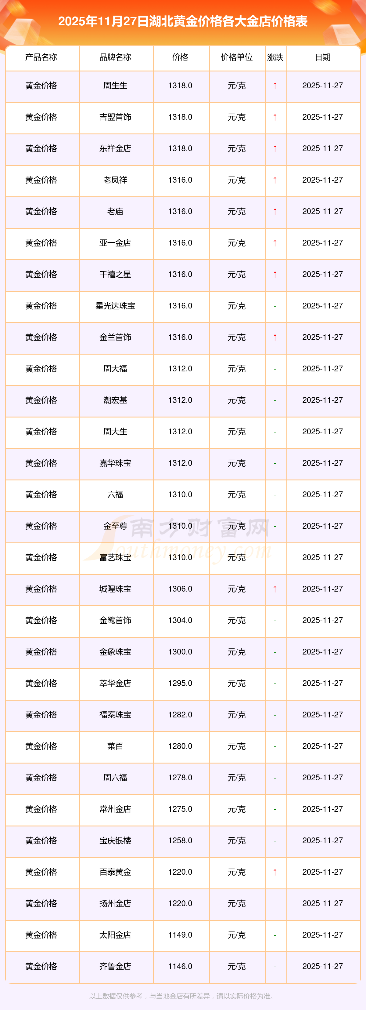 2025年11月27日湖北各大金店黃金價格最新價格:周大福1312.0元/克,周大福652.0元/克,老鳳祥1316.0元/克,老鳳祥600.0元/克,六福1310.0元/克,六福652.0元/克,六福18700.0,菜百1280.0元/克,菜百540.0元/克,老廟1316.0元/克,老廟600.0元/克。