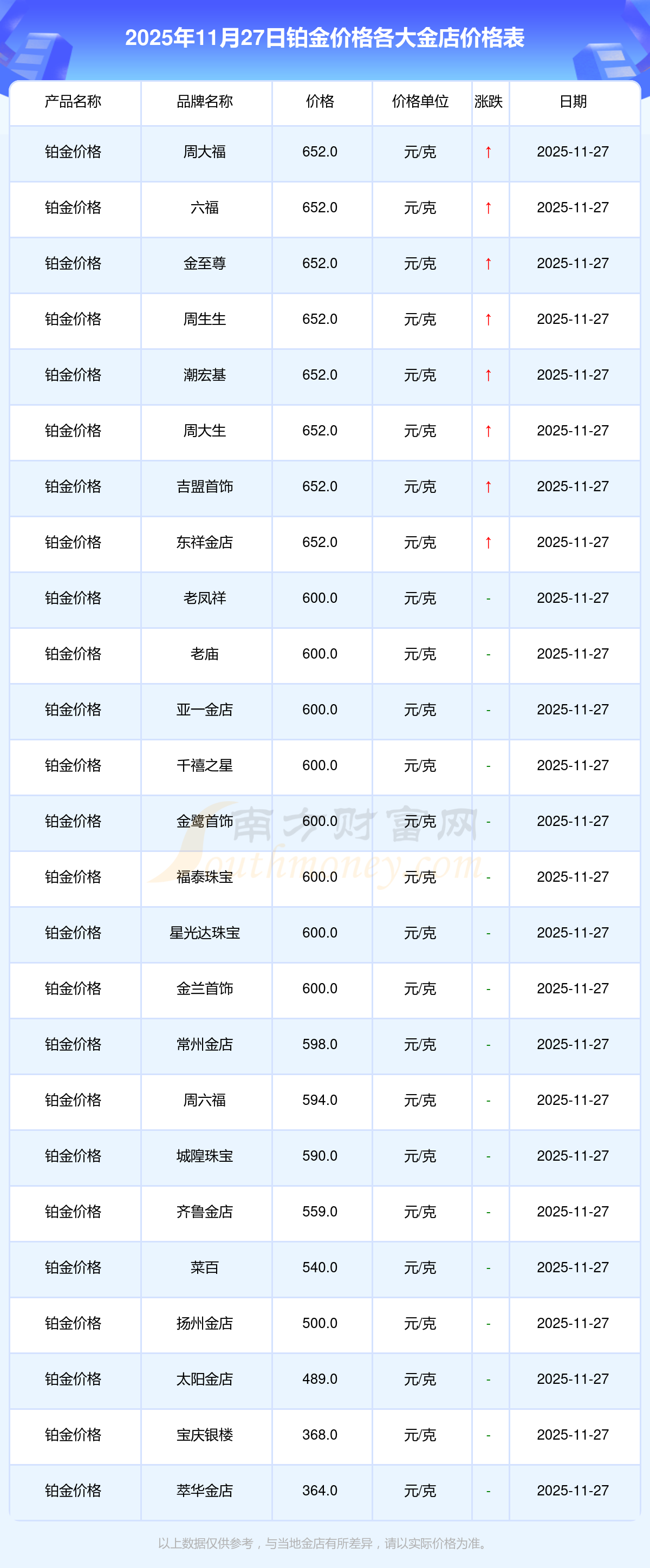 今天是2025年11月27日,周大福、周大福、老鳳祥、老鳳祥、六福、六福、六福、菜百、菜百、老廟、老廟等各大金店品牌鉑金價(jià)格最新價(jià)格如下:周大福1312.0元/克、周大福652.0元/克、老鳳祥1316.0元/克、老鳳祥600.0元/克、六福1310.0元/克、六福652.0元/克、六福18700.0、菜百1280.0元/克、菜百540.0元/克、老廟1316.0元/克、老廟600.0元/克。