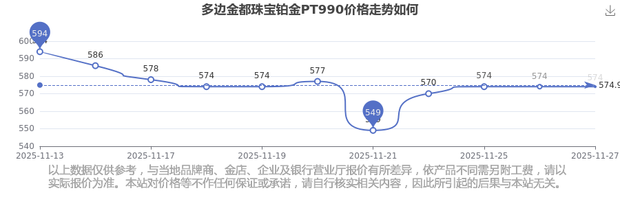 2025年11月27日多邊金都珠寶鉑金PT990價格最新為574.0元/克。