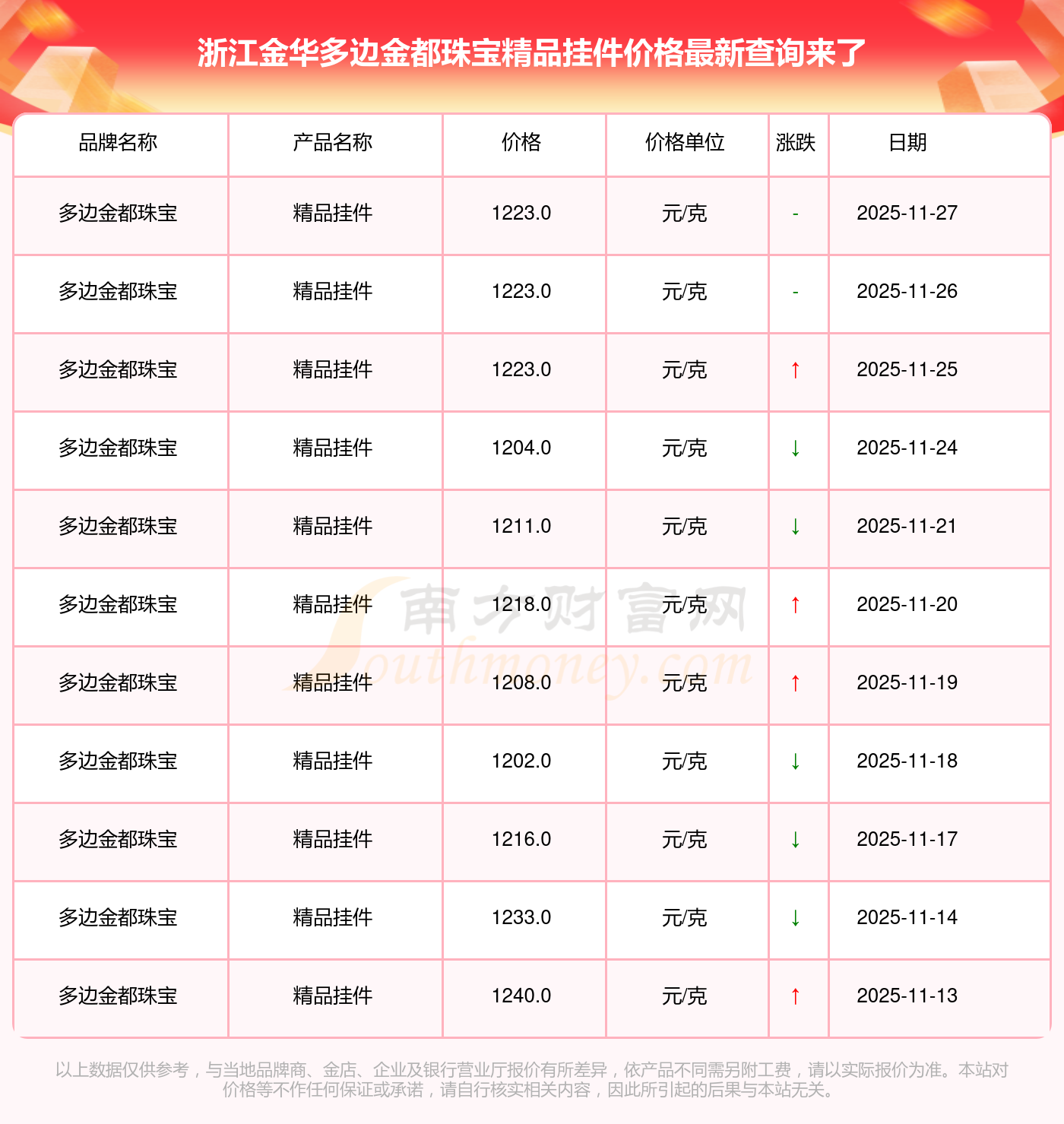 2025年11月27日,浙江金華多邊金都珠寶精品掛件每克的售賣價位為1223.0元/克。