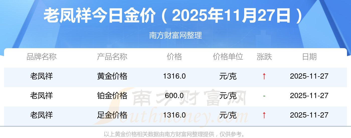 2025年11月27日周大福、周大福、老鳳祥、老鳳祥、六福、六福、六福、菜百、菜百、老廟、老廟等各大金店品牌黃金價格最新價格如下:周大福黃金價格1312.0元/克,周大福鉑金價格652.0元/克,老鳳祥黃金價格1316.0元/克,老鳳祥鉑金價格600.0元/克,六福黃金價格1310.0元/克,六福鉑金價格652.0元/克,六福鉑金價格(香港)18700.0,菜百黃金價格1280.0元/克,菜百鉑金價格540.0元/克,老廟黃金價格1316.0元/克,老廟鉑金價格600.0元/克。