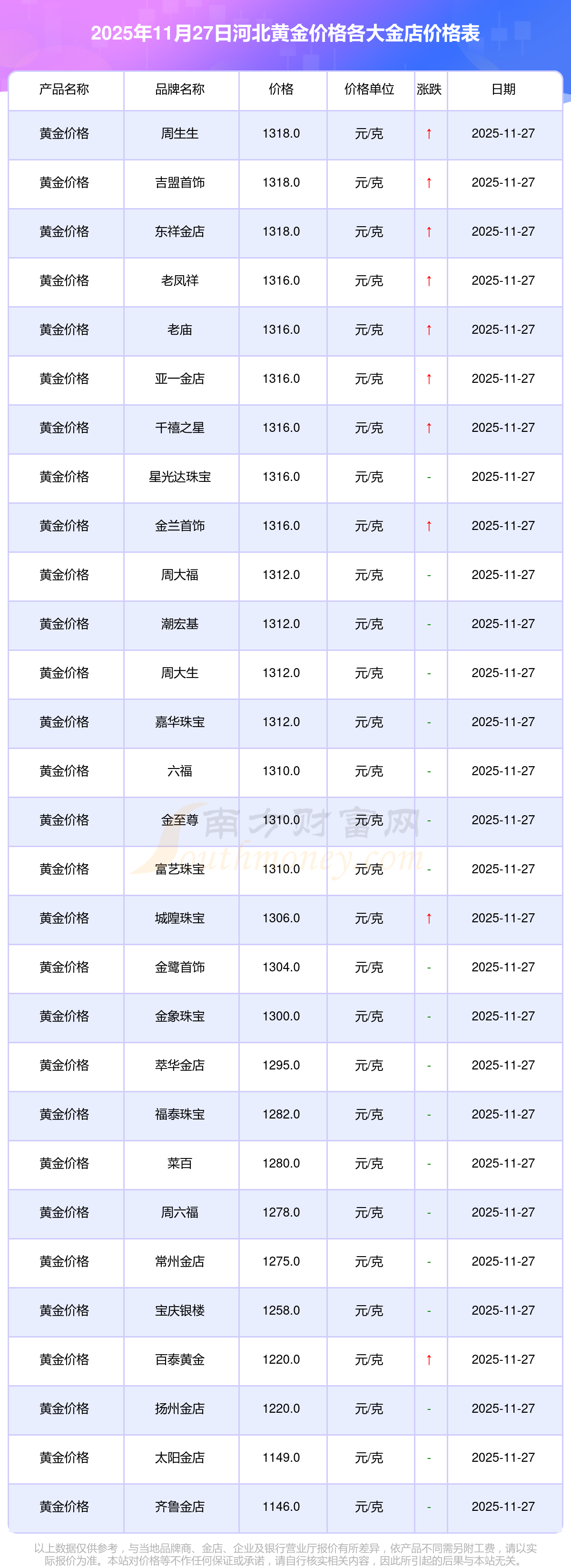 2025年11月27日河北周大福、周大福、老鳳祥、老鳳祥、六福、六福、六福、菜百、菜百、老廟、老廟等各大金店品牌黃金價格最新價格如下:周大福黃金價格1312.0元/克,周大福鉑金價格652.0元/克,老鳳祥黃金價格1316.0元/克,老鳳祥鉑金價格600.0元/克,六福黃金價格1310.0元/克,六福鉑金價格652.0元/克,六福鉑金價格(香港)18700.0,菜百黃金價格1280.0元/克,菜百鉑金價格540.0元/克,老廟黃金價格1316.0元/克,老廟鉑金價格600.0元/克。