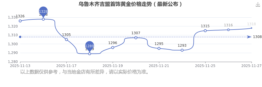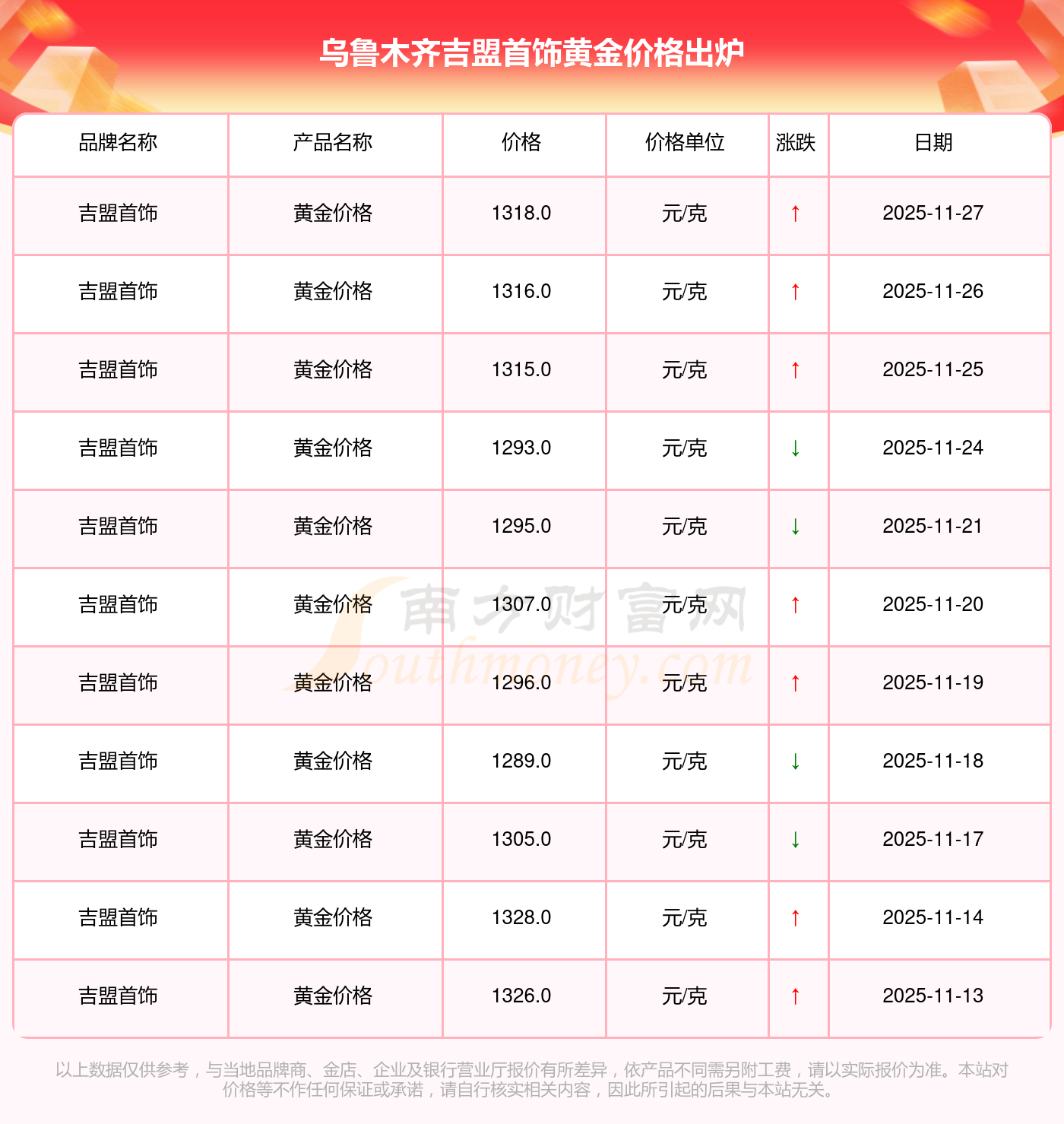 今日(2025年11月27日)烏魯木齊吉盟首飾黃金價格為1318.0元/克。