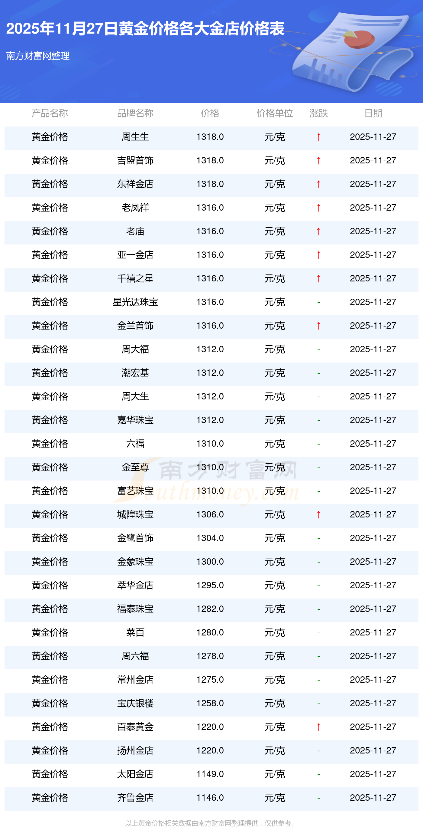各大金店黃金價(jià)格最新價(jià)格公布,2025年11月27日各大金店黃金價(jià)格多少錢一克?