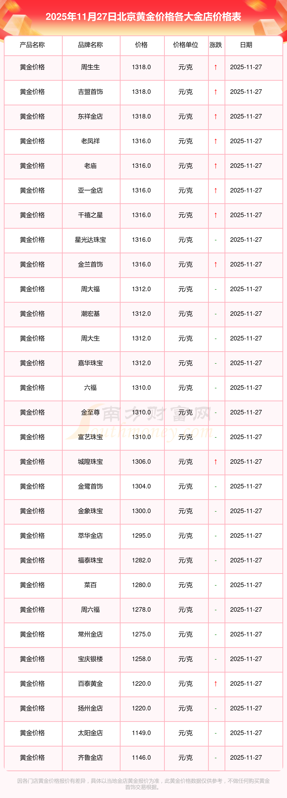 2025年11月27日北京周大福、周大福、老鳳祥、老鳳祥、六福、六福、六福、菜百、菜百、老廟、老廟等各大金店品牌黃金價格最新價格如下:周大福黃金價格1312.0元/克,周大福鉑金價格652.0元/克,老鳳祥黃金價格1316.0元/克,老鳳祥鉑金價格600.0元/克,六福黃金價格1310.0元/克,六福鉑金價格652.0元/克,六福鉑金價格(香港)18700.0,菜百黃金價格1280.0元/克,菜百鉑金價格540.0元/克,老廟黃金價格1316.0元/克,老廟鉑金價格600.0元/克。