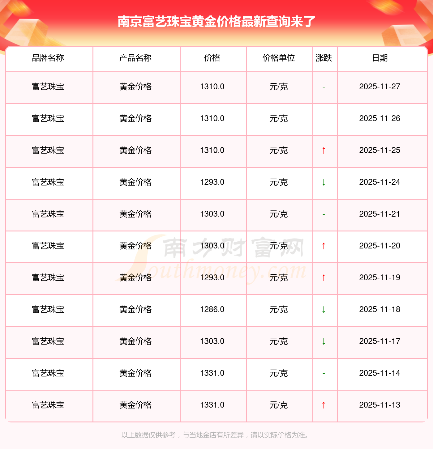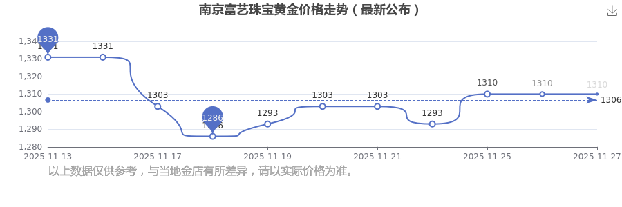 2025年11月27日,南京富藝珠寶的黃金價格標價達到 1310.0元/克。