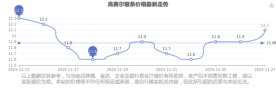 高賽爾今日 銀條的最新市場行情價為12.1元/克。