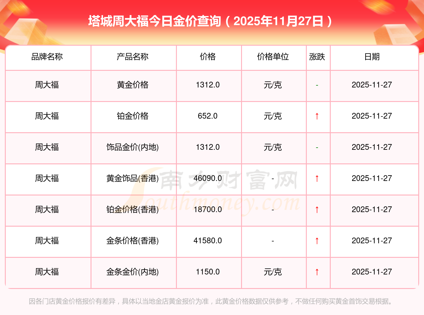 2025年11月27日塔城周大福一克黃金對應的價格是多少?黃金價格1312.0元/克,鉑金價格652.0元/克,黃金價格1316.0元/克,鉑金價格600.0元/克,黃金價格1310.0元/克,鉑金價格652.0元/克,鉑金價格(香港)18700.0,黃金價格1280.0元/克,鉑金價格540.0元/克,黃金價格1316.0元/克,鉑金價格600.0元/克。