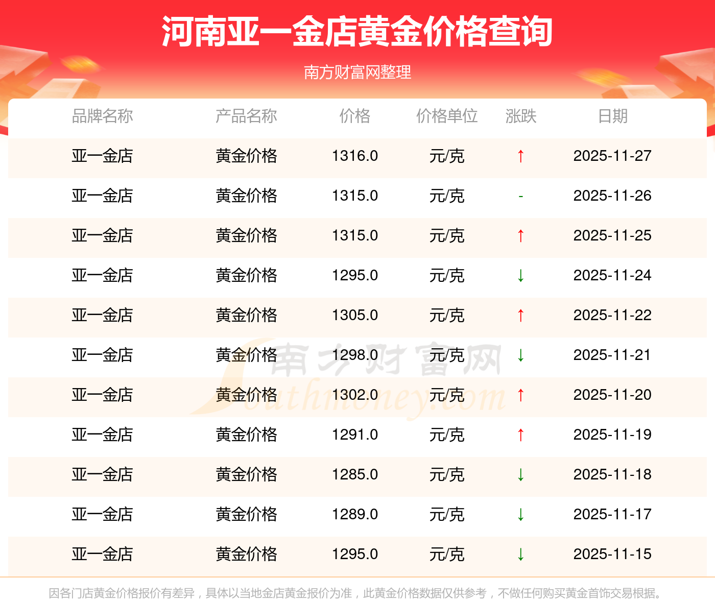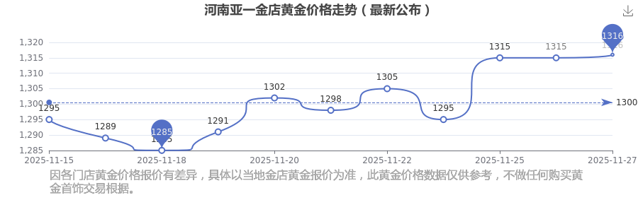 今日(2025年11月27日),河南亞一金店黃金價格每克的價值為1316.0元/克。