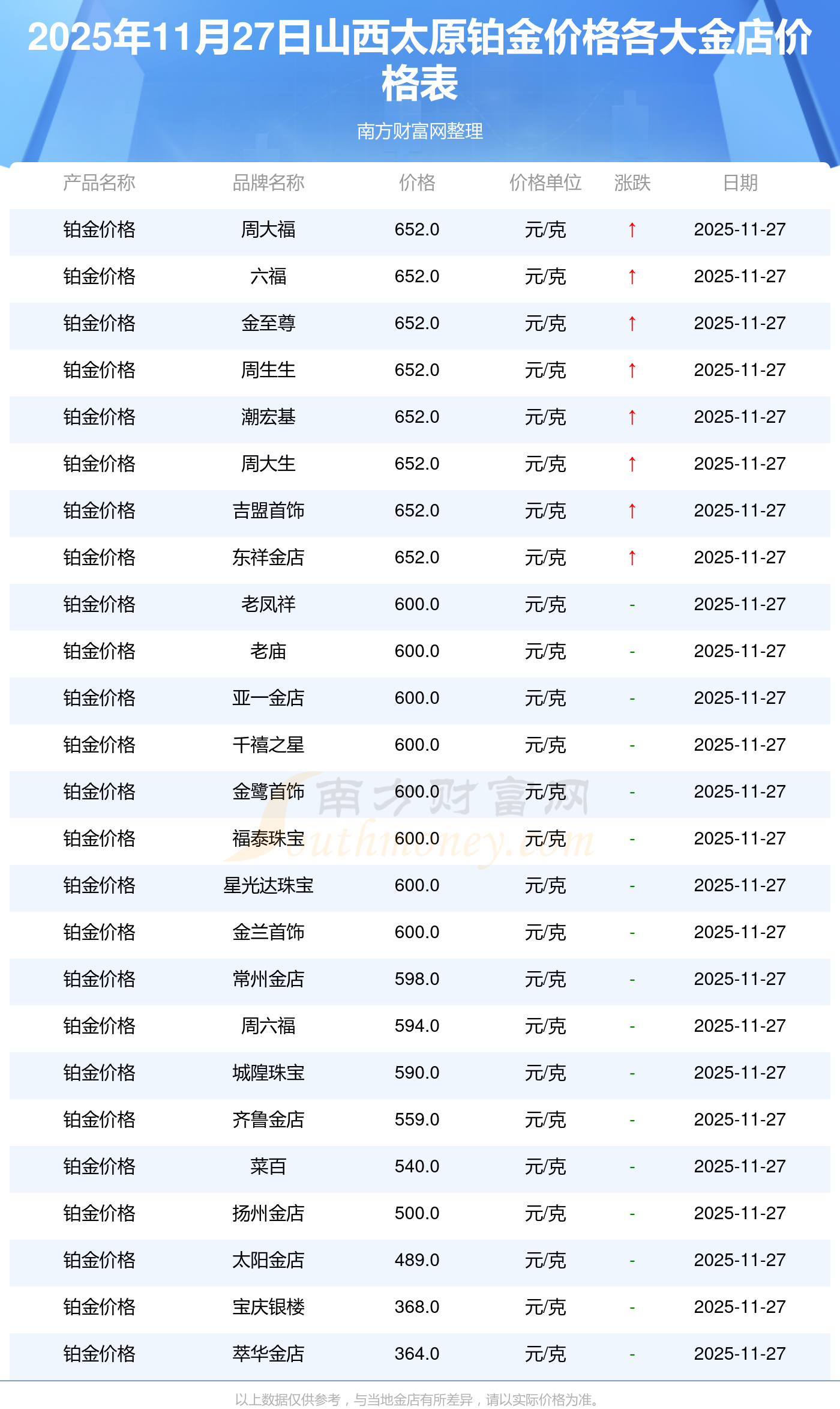 2025年11月27日山西太原各大金店鉑金價格最新價格:周大福1312.0元/克,周大福652.0元/克,老鳳祥1316.0元/克,老鳳祥600.0元/克,六福1310.0元/克,六福652.0元/克,六福18700.0,菜百1280.0元/克,菜百540.0元/克,老廟1316.0元/克,老廟600.0元/克。