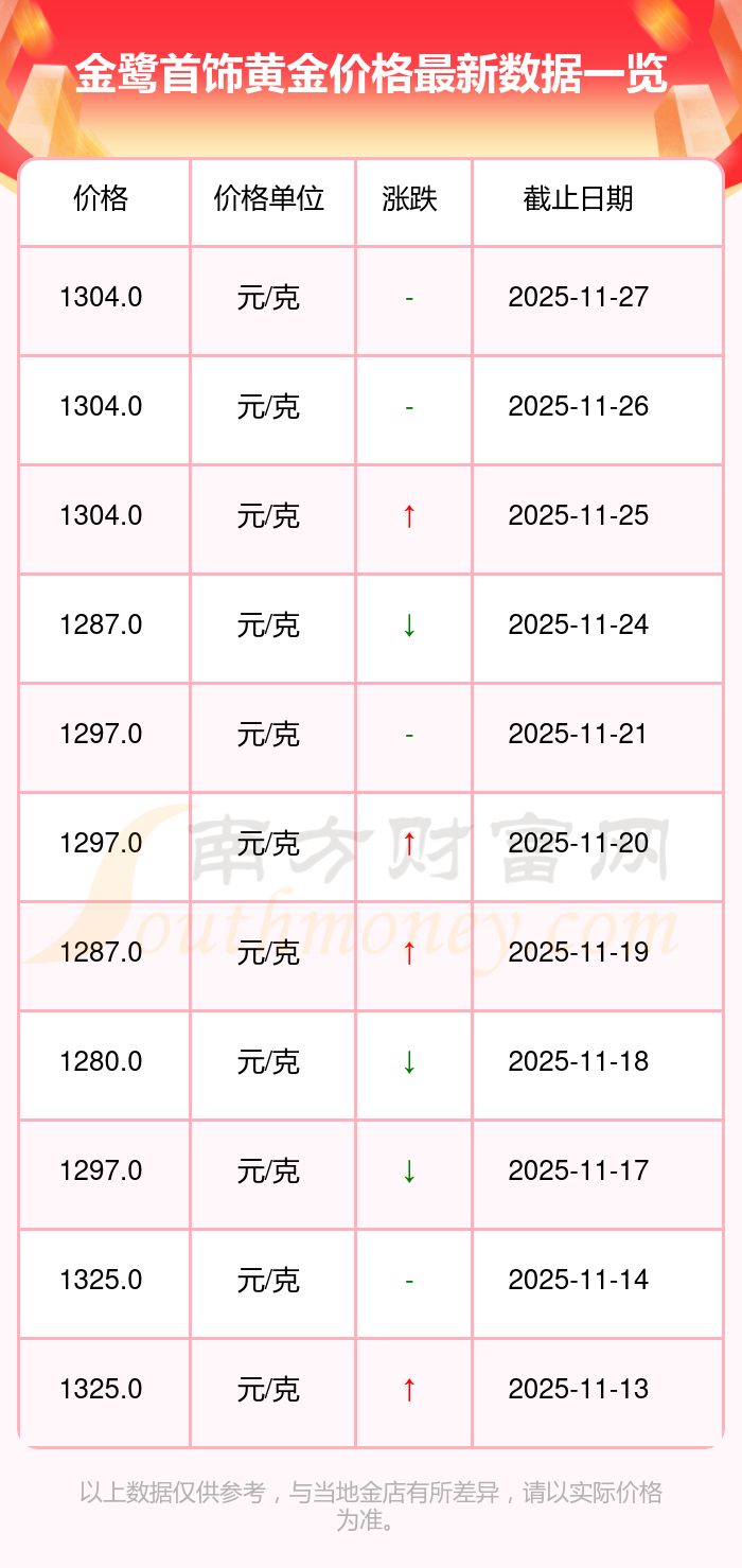 因各門店黃金價格報價有差異,具體以當(dāng)?shù)亟鸬挈S金報價為準,此黃金價格數(shù)據(jù)僅供參考,不做任何購買黃金首飾交易根據(jù)。