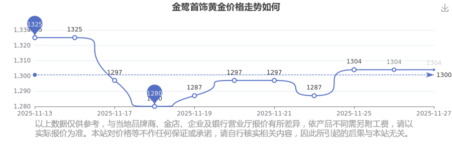 金鷺首飾 黃金價格今日最新的價位是1304.0元/克。