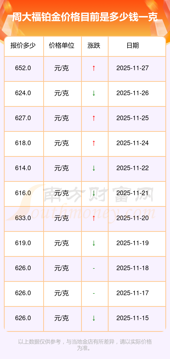 今日周大福鉑金價(jià)格的價(jià)格是652.0元/克。