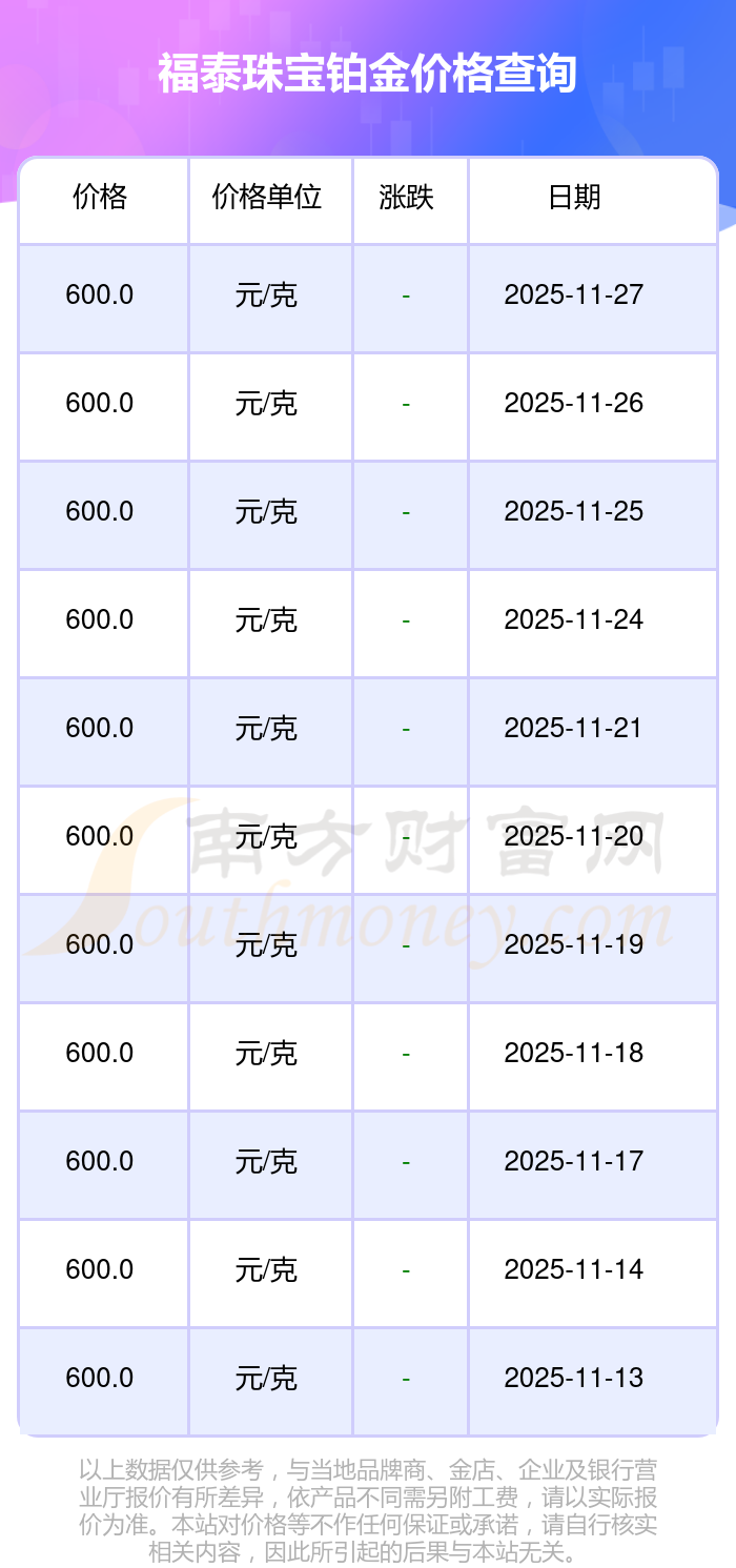 今日福泰珠寶所公布的 鉑金價(jià)格最新價(jià)格為600.0元/克。
