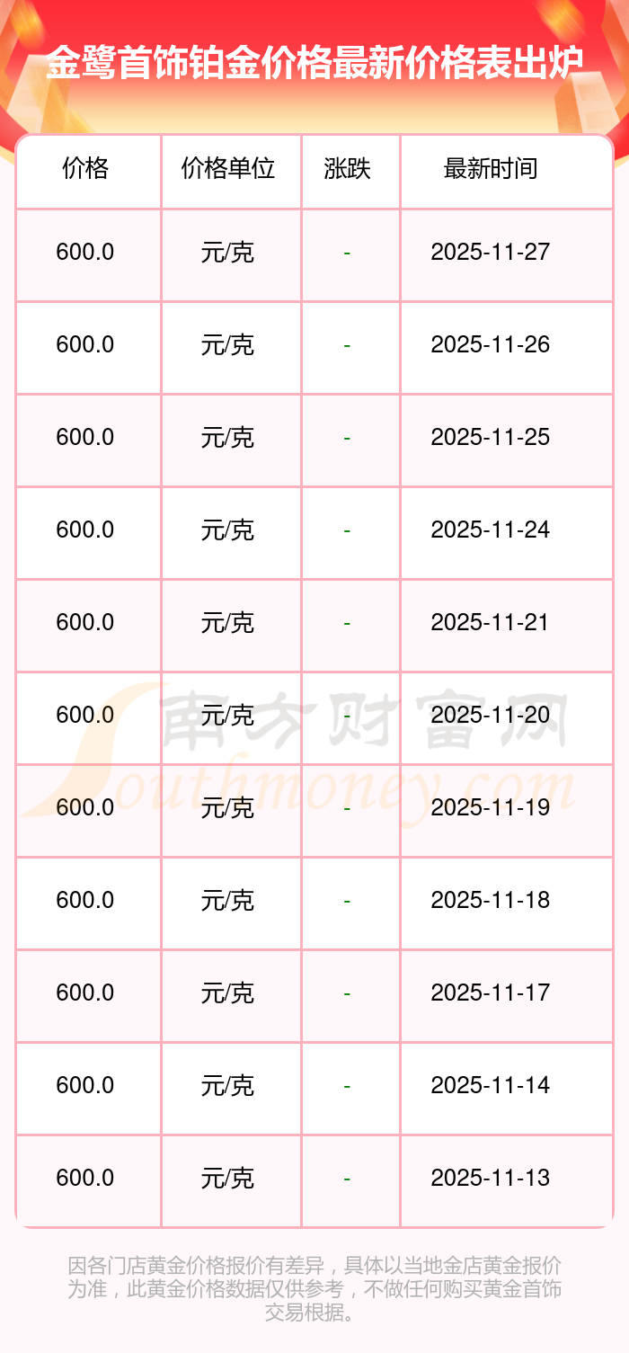 今日金鷺首飾鉑金價格為600.0元/克。