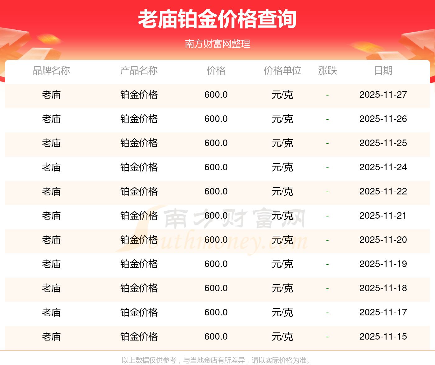 老廟今日 鉑金價格的最新市場行情價為600.0元/克。