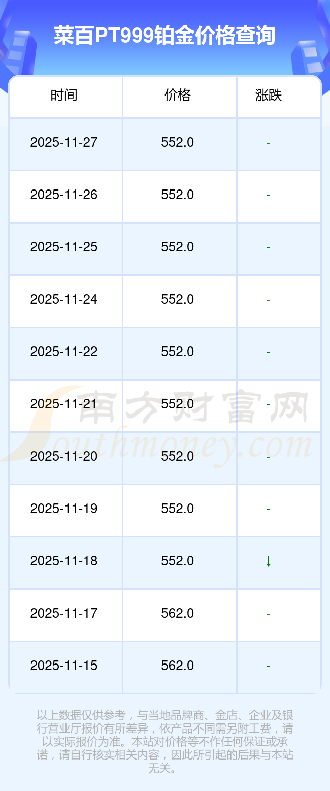 當(dāng)下,菜百 PT999鉑金今日的最新價(jià)格是552.0元/克。