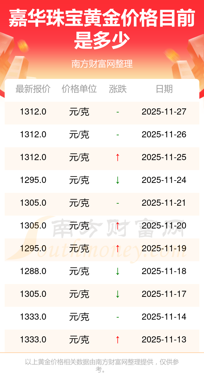2025年11月28日嘉華珠寶黃金價格查詢:1312.0元/克。