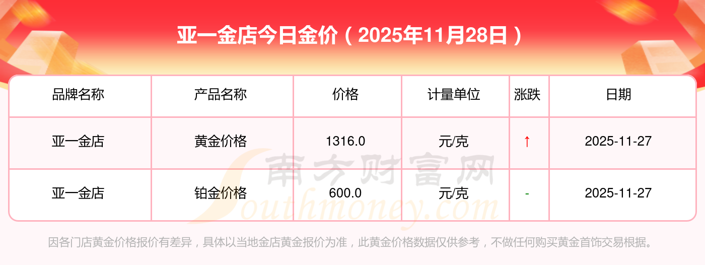 現(xiàn)在亞一金店黃金價(jià)格是多少錢(qián)1克_2025年亞一金店今日金價(jià)是多少錢(qián)一克,最新亞一金店查詢(xún),2025年11月28日亞一金店鉑金價(jià)格現(xiàn)在每克多少錢(qián)?最新亞一金店鉑金價(jià)格報(bào)價(jià)公布,一起來(lái)看看吧!