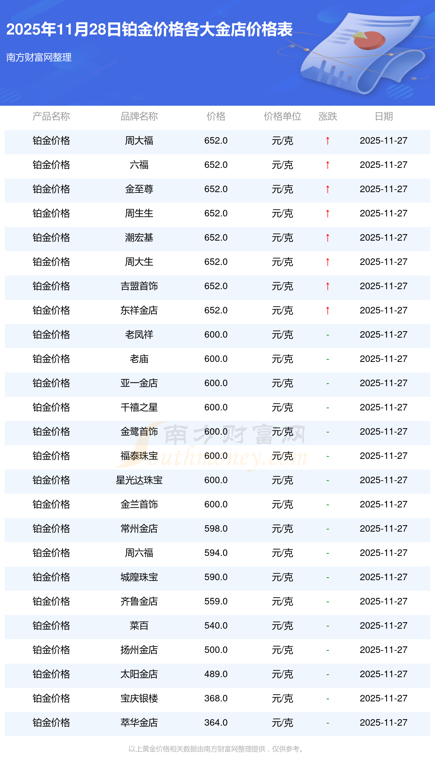 2025年11月28日各大金店鉑金價格最新價格:周大福1312.0元/克,周大福652.0元/克,老鳳祥1316.0元/克,老鳳祥600.0元/克,六福1310.0元/克,六福652.0元/克,六福18700.0,菜百1280.0元/克,菜百540.0元/克,老廟1316.0元/克,老廟600.0元/克。