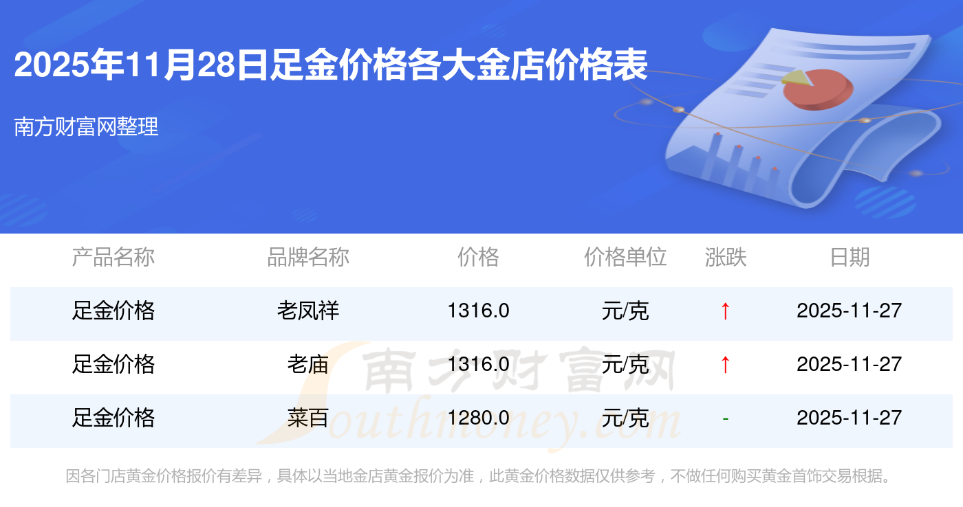 2025年11月28日,周大福、周大福、老鳳祥、老鳳祥、六福、六福、六福、菜百、菜百、老廟、老廟等各大金店品牌足金價格今日價格如下:周大福1312.0元/克、周大福652.0元/克、老鳳祥1316.0元/克、老鳳祥600.0元/克、六福1310.0元/克、六福652.0元/克、六福18700.0、菜百1280.0元/克、菜百540.0元/克、老廟1316.0元/克、老廟600.0元/克。