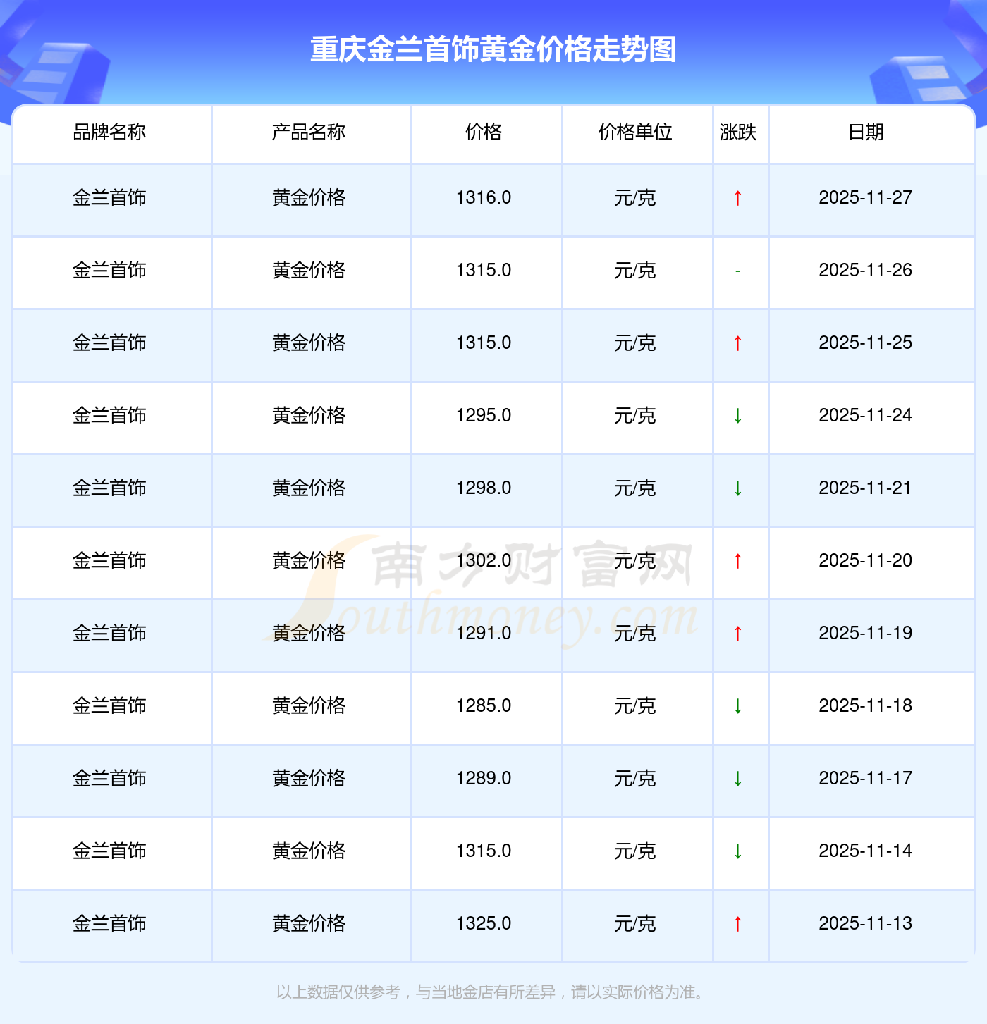 今天是2025年11月28日,周大福、周大福、老鳳祥、老鳳祥、六福、六福、六福、菜百、菜百、老廟、老廟等各大金店品牌黃金價格最新價格如下:周大福1312.0元/克、周大福652.0元/克、老鳳祥1316.0元/克、老鳳祥600.0元/克、六福1310.0元/克、六福652.0元/克、六福18700.0、菜百1280.0元/克、菜百540.0元/克、老廟1316.0元/克、老廟600.0元/克。