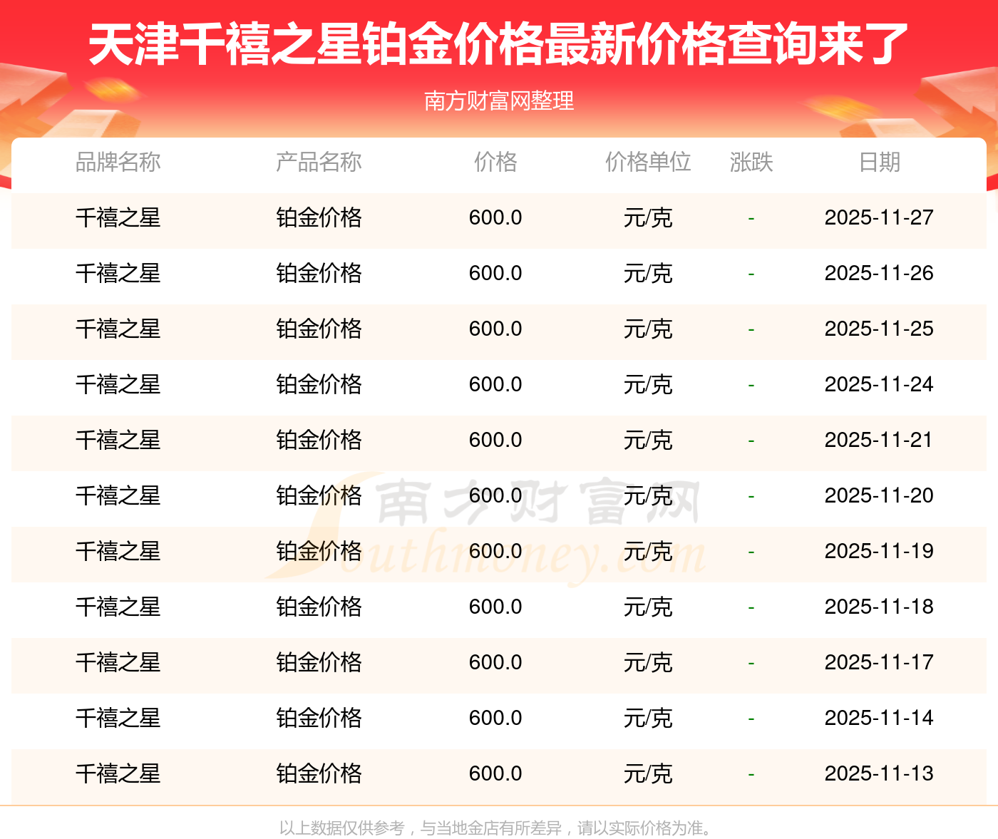 2025年11月28日各大金店鉑金價(jià)格最新價(jià)格:周大福1312.0元/克,周大福652.0元/克,老鳳祥1316.0元/克,老鳳祥600.0元/克,六福1310.0元/克,六福652.0元/克,六福18700.0,菜百1280.0元/克,菜百540.0元/克,老廟1316.0元/克,老廟600.0元/克。