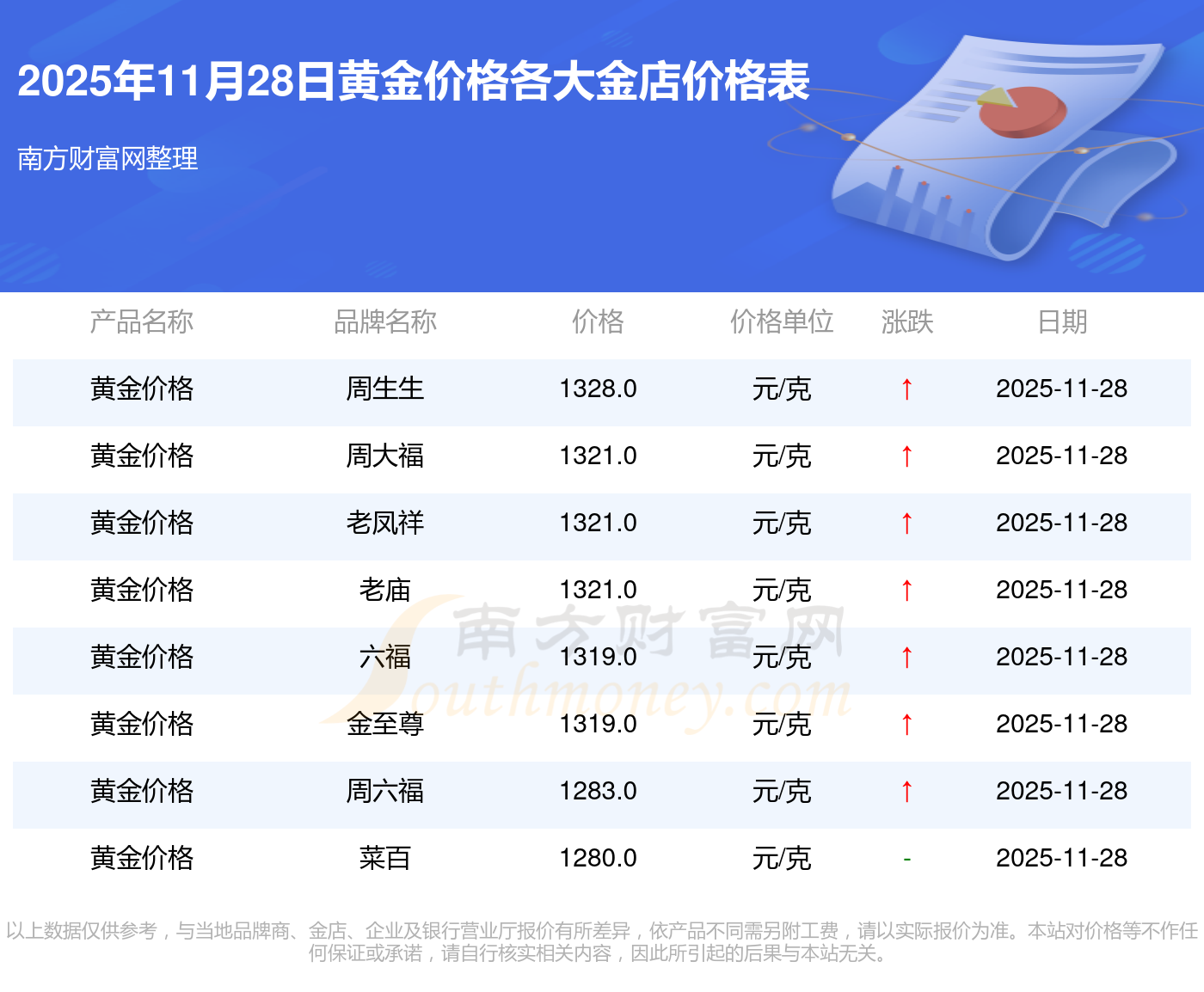 2025年11月28日周大福、周大福、周大福、周大福、周大福、周大福、周大福、老鳳祥、老鳳祥、老鳳祥、周六福等各大金店品牌黃金價(jià)格最新價(jià)格如下:周大福黃金價(jià)格1321.0元/克,周大福鉑金價(jià)格654.0元/克,周大福飾品金價(jià)(內(nèi)地)1321.0元/克,周大福黃金飾品(香港)46420.0,周大福鉑金價(jià)格(香港)19060.0,周大福金條價(jià)格(香港)41870.0,周大福金條金價(jià)(內(nèi)地)1158.0元/克,老鳳祥黃金價(jià)格1321.0元/克,老鳳祥鉑金價(jià)格600.0元/克,老鳳祥足金價(jià)格1321.0元/克,周六福黃金價(jià)格1283.0元/克。