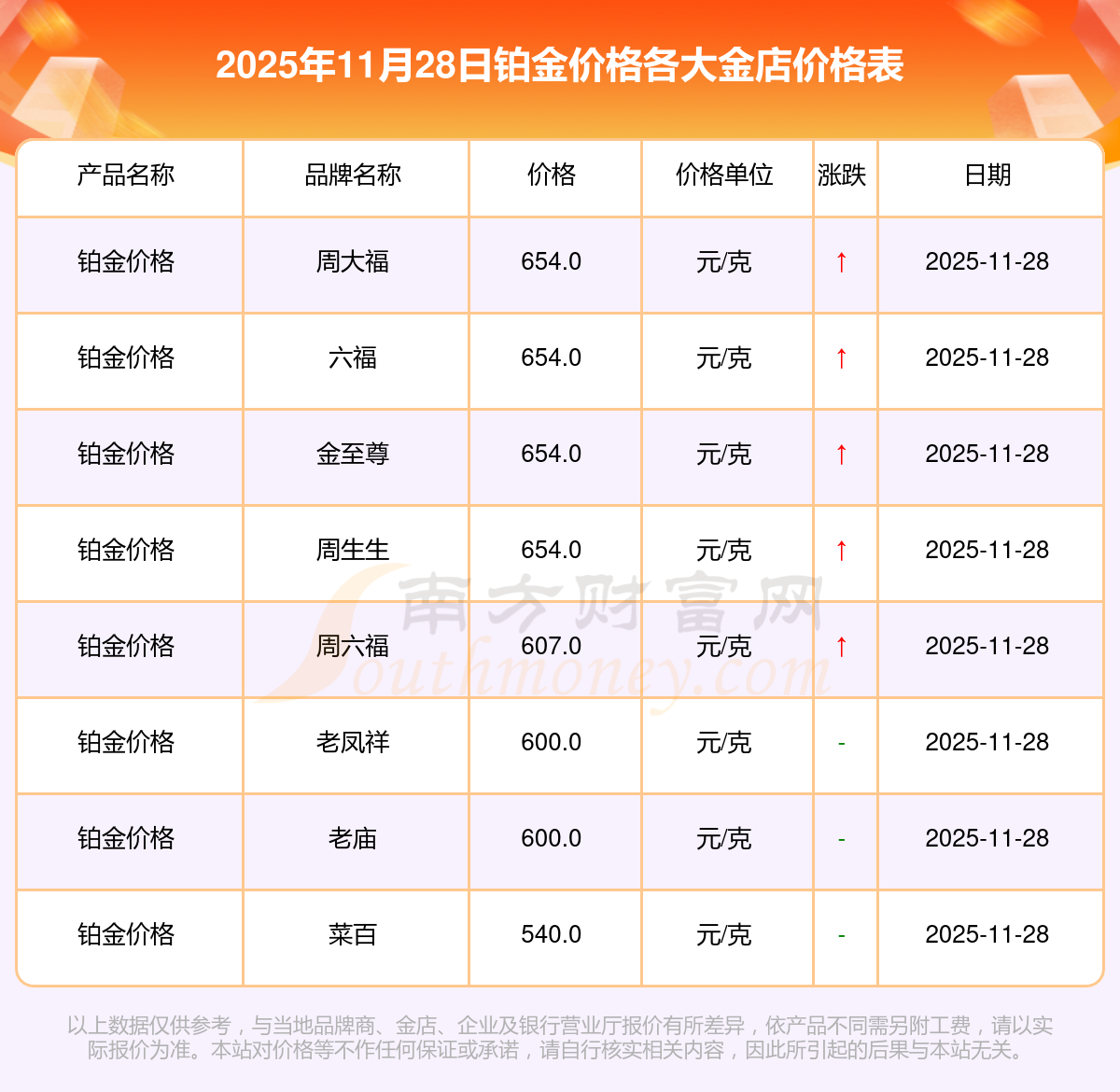 今天是2025年11月28日,周大福、周大福、周大福、周大福、周大福、周大福、周大福、老鳳祥、老鳳祥、老鳳祥、周六福等各大金店品牌鉑金價格最新價格如下:周大福1321.0元/克、周大福654.0元/克、周大福1321.0元/克、周大福46420.0、周大福19060.0、周大福41870.0、周大福1158.0元/克、老鳳祥1321.0元/克、老鳳祥600.0元/克、老鳳祥1321.0元/克、周六福1283.0元/克。