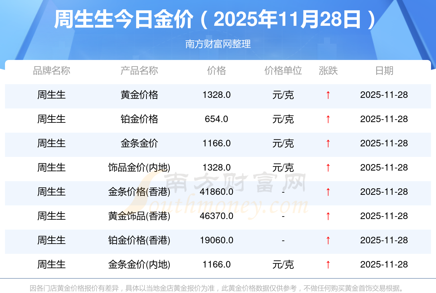 今天是2025年11月28日,周大福、周大福、周大福、周大福、周大福、周大福、周大福、老鳳祥、老鳳祥、老鳳祥、周六福等各大金店品牌鉑金價(jià)格最新價(jià)格如下:周大福1321.0元/克、周大福654.0元/克、周大福1321.0元/克、周大福46420.0、周大福19060.0、周大福41870.0、周大福1158.0元/克、老鳳祥1321.0元/克、老鳳祥600.0元/克、老鳳祥1321.0元/克、周六福1283.0元/克。