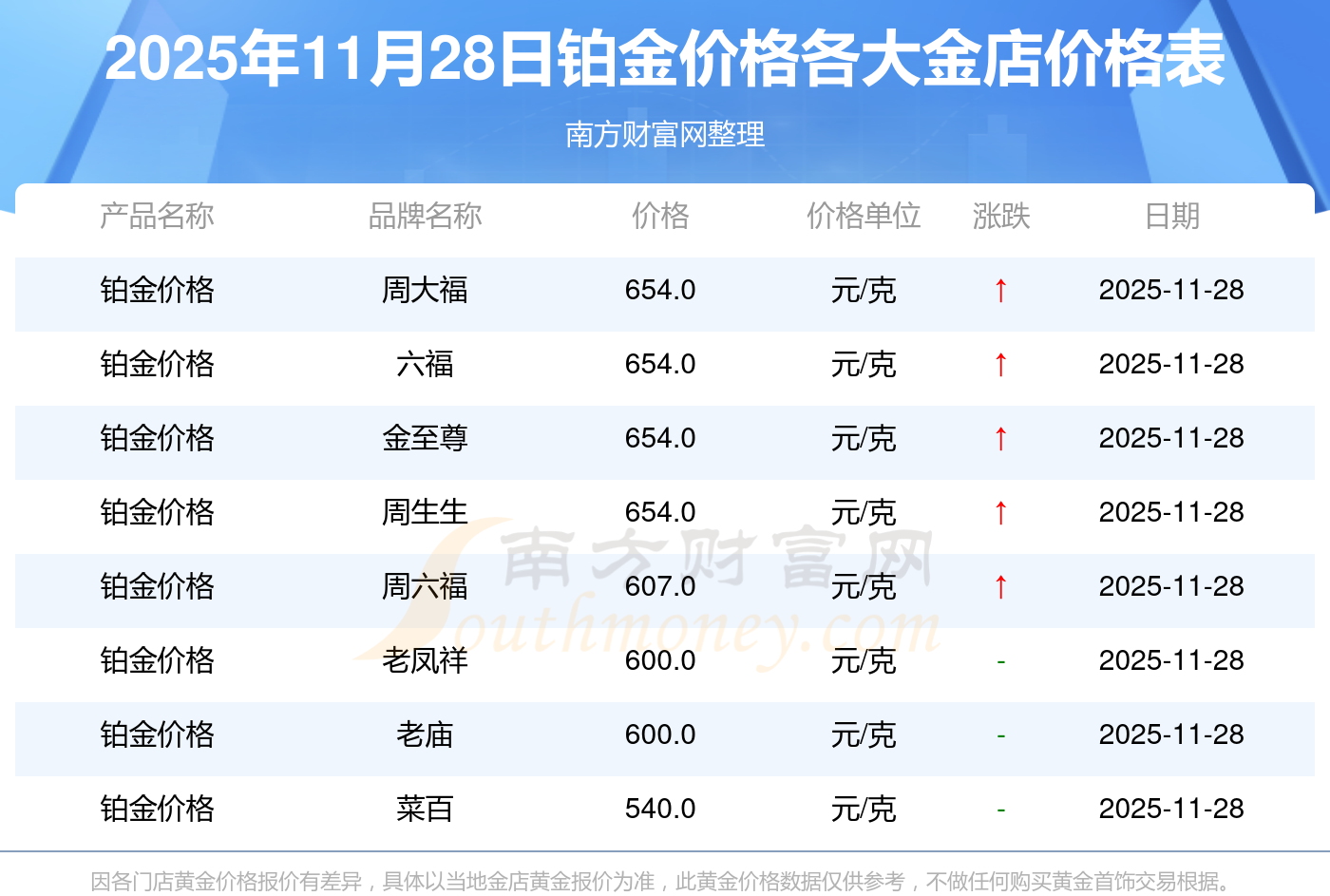 今天是2025年11月28日,周大福、周大福、周大福、周大福、周大福、周大福、周大福、老鳳祥、老鳳祥、老鳳祥、周六福等各大金店品牌鉑金價格最新價格如下:周大福1321.0元/克、周大福654.0元/克、周大福1321.0元/克、周大福46420.0、周大福19060.0、周大福41870.0、周大福1158.0元/克、老鳳祥1321.0元/克、老鳳祥600.0元/克、老鳳祥1321.0元/克、周六福1283.0元/克。