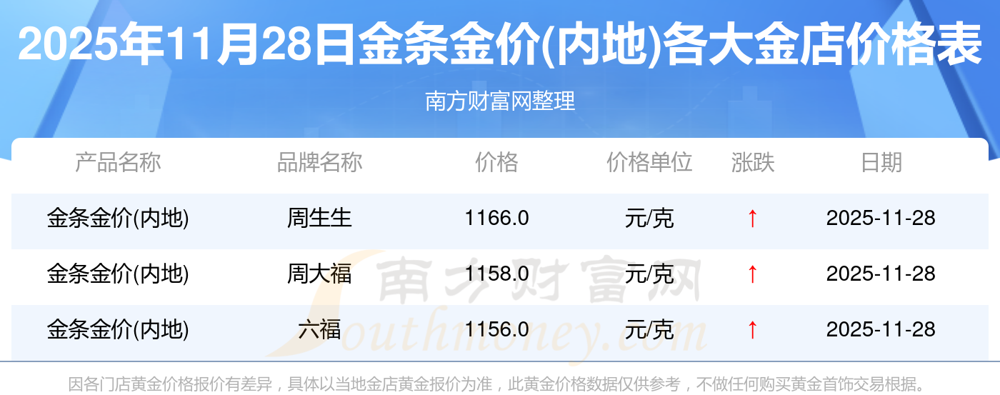 今天是2025年11月28日,周大福、周大福、周大福、周大福、周大福、周大福、周大福、老鳳祥、老鳳祥、老鳳祥、周六福等各大金店品牌金條金價(jià)(內(nèi)地)最新價(jià)格如下:周大福1321.0元/克、周大福654.0元/克、周大福1321.0元/克、周大福46420.0、周大福19060.0、周大福41870.0、周大福1158.0元/克、老鳳祥1321.0元/克、老鳳祥600.0元/克、老鳳祥1321.0元/克、周六福1283.0元/克。