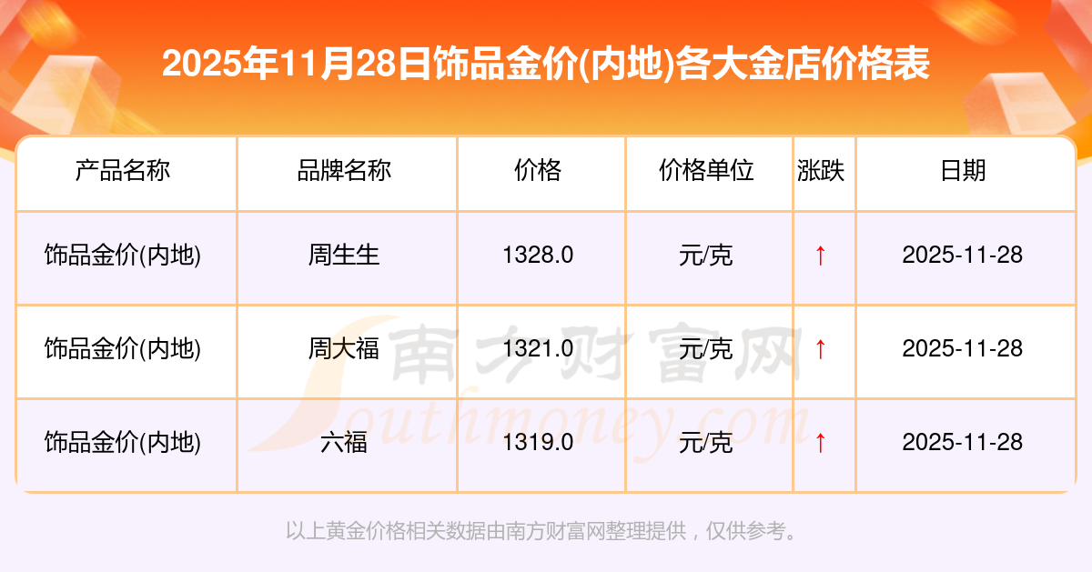 2025年11月28日周大福、周大福、周大福、周大福、周大福、周大福、周大福、老鳳祥、老鳳祥、老鳳祥、周六福等各大金店品牌飾品金價(jià)(內(nèi)地)最新價(jià)格如下:周大福黃金價(jià)格1321.0元/克,周大福鉑金價(jià)格654.0元/克,周大福飾品金價(jià)(內(nèi)地)1321.0元/克,周大福黃金飾品(香港)46420.0,周大福鉑金價(jià)格(香港)19060.0,周大福金條價(jià)格(香港)41870.0,周大福金條金價(jià)(內(nèi)地)1158.0元/克,老鳳祥黃金價(jià)格1321.0元/克,老鳳祥鉑金價(jià)格600.0元/克,老鳳祥足金價(jià)格1321.0元/克,周六福黃金價(jià)格1283.0元/克。