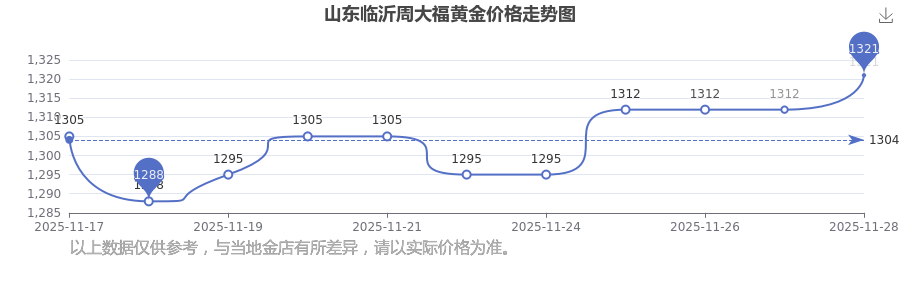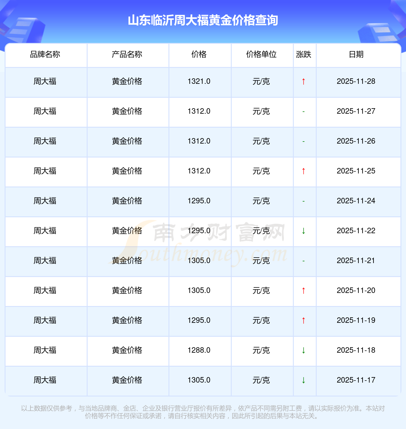2025年11月28日這一天,山東臨沂周大福的黃金價格以 1321.0元/克的價格售賣。