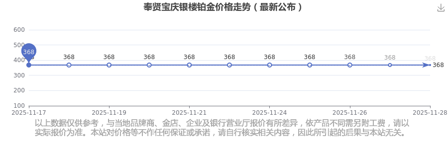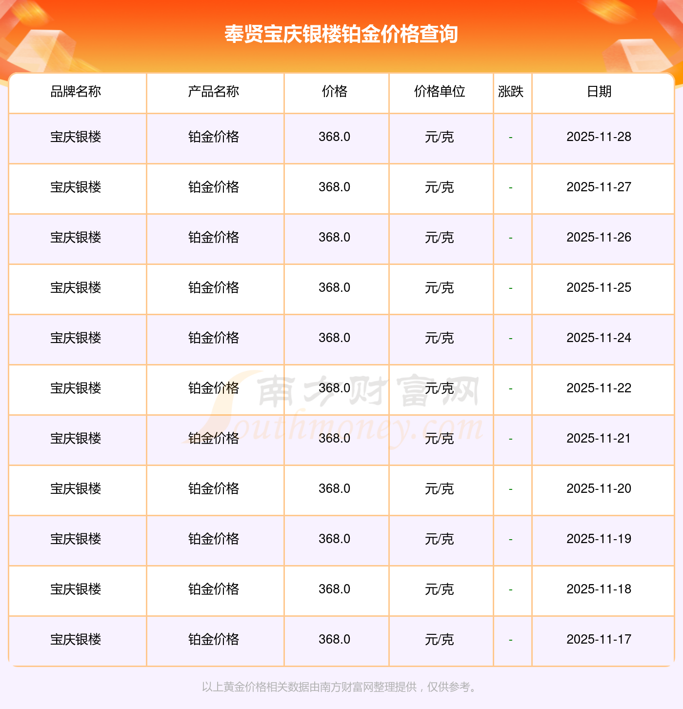 今日奉賢寶慶銀樓鉑金價(jià)格最新為:368.0元/克。