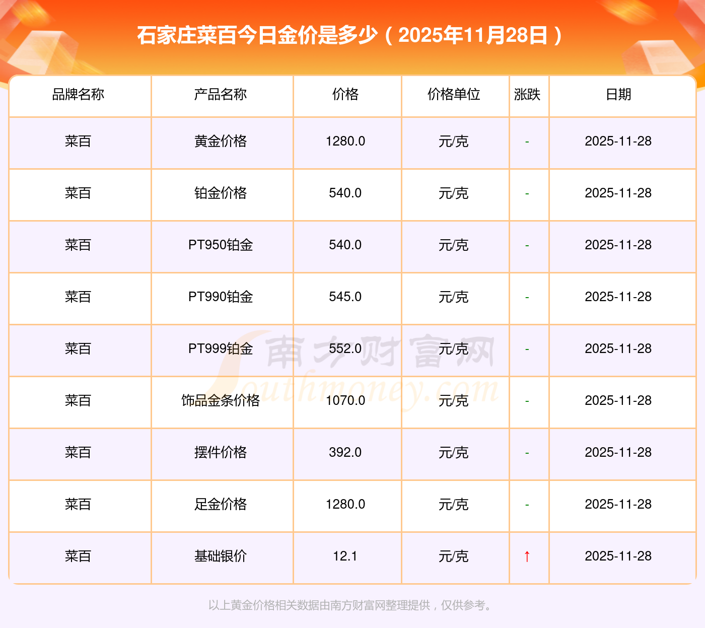 石家莊菜百金價(jià)今日價(jià)格最新_石家莊菜百黃金多少錢(qián)一克2025年11月28日,隨小編來(lái)了解一下詳情。
