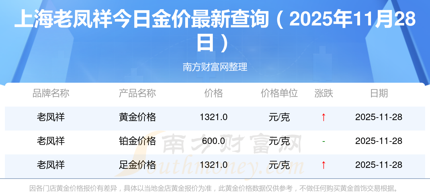 今日黃金價格情況如何?此刻黃金一克要多少錢?2025年11月28日上海老鳳祥今日價格:黃金價格1321.0元/克,鉑金價格600.0元/克,銀條價格12.6元/克,黃金價格1321.0元/克,鉑金價格600.0元/克,金條價格(內(nèi)地)1207.0元/克,金飾價格(內(nèi)地)1321.0元/克,黃金飾品(香港)46370.0,鉑金飾品(香港)13970.0,金條金價(香港)41860.0,投資金條1296.0元/克。