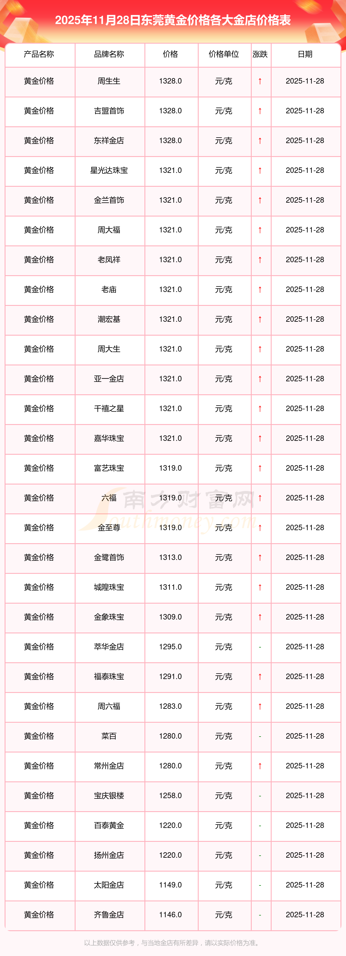 2025年11月28日東莞各大金店黃金價格最新價格:星光達(dá)珠寶1321.0元/克,星光達(dá)珠寶600.0元/克,寶泉錢幣12.6元/克,金蘭首飾1321.0元/克,金蘭首飾600.0元/克,謝瑞麟1207.0元/克,謝瑞麟1321.0元/克,謝瑞麟46370.0,謝瑞麟13970.0,謝瑞麟41860.0,金銀街1296.0元/克。