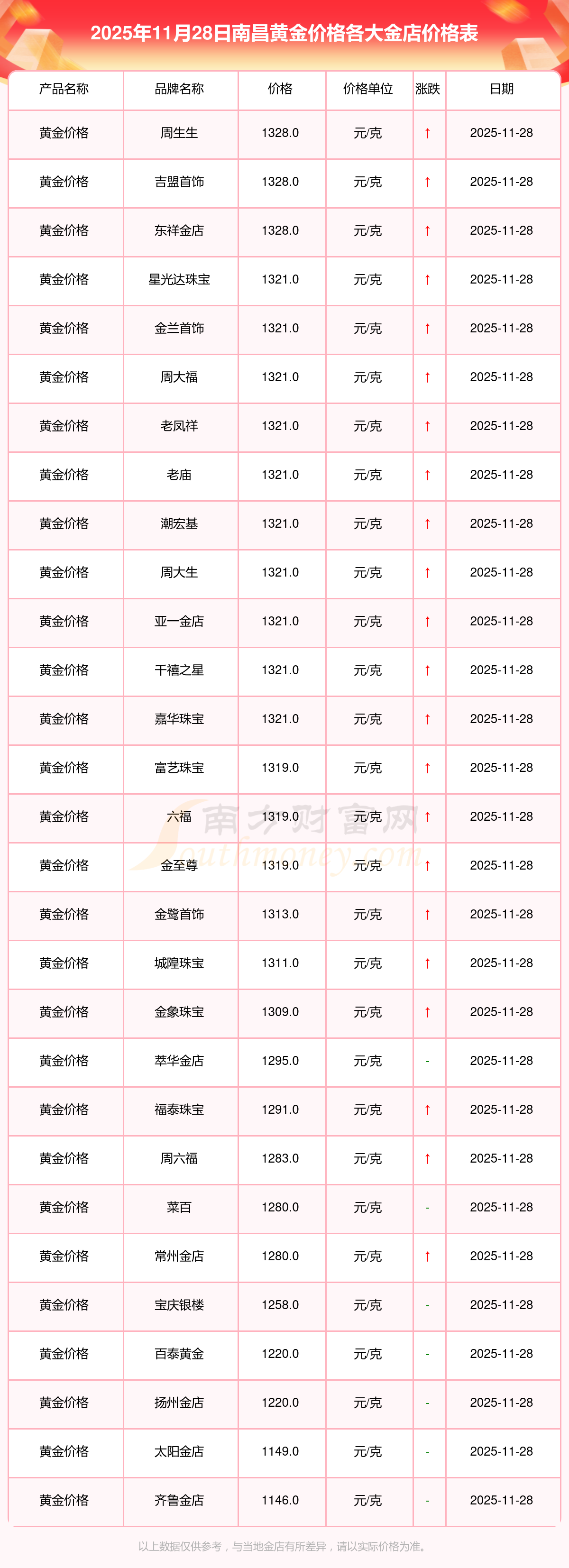 2025年11月28日,南昌星光達(dá)珠寶、星光達(dá)珠寶、寶泉錢幣、金蘭首飾、金蘭首飾、謝瑞麟、謝瑞麟、謝瑞麟、謝瑞麟、謝瑞麟、金銀街等各大金店品牌黃金價(jià)格今日價(jià)格行情最新來了:星光達(dá)珠寶1321.0元/克、星光達(dá)珠寶600.0元/克、寶泉錢幣12.6元/克、金蘭首飾1321.0元/克、金蘭首飾600.0元/克、謝瑞麟1207.0元/克、謝瑞麟1321.0元/克、謝瑞麟46370.0、謝瑞麟13970.0、謝瑞麟41860.0、金銀街1296.0元/克。