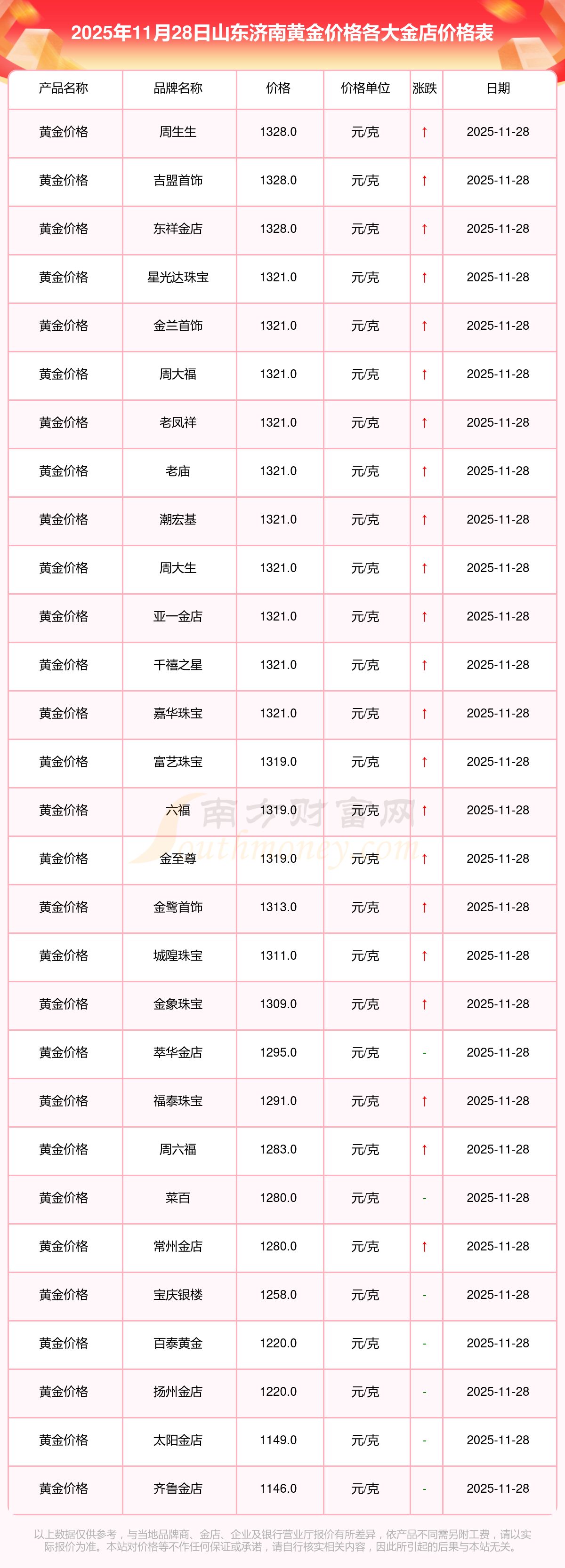 2025年11月28日,山東濟南星光達珠寶、星光達珠寶、寶泉錢幣、金蘭首飾、金蘭首飾、謝瑞麟、謝瑞麟、謝瑞麟、謝瑞麟、謝瑞麟、金銀街等各大金店品牌黃金價格今日價格行情最新來了:星光達珠寶1321.0元/克、星光達珠寶600.0元/克、寶泉錢幣12.6元/克、金蘭首飾1321.0元/克、金蘭首飾600.0元/克、謝瑞麟1207.0元/克、謝瑞麟1321.0元/克、謝瑞麟46370.0、謝瑞麟13970.0、謝瑞麟41860.0、金銀街1296.0元/克。